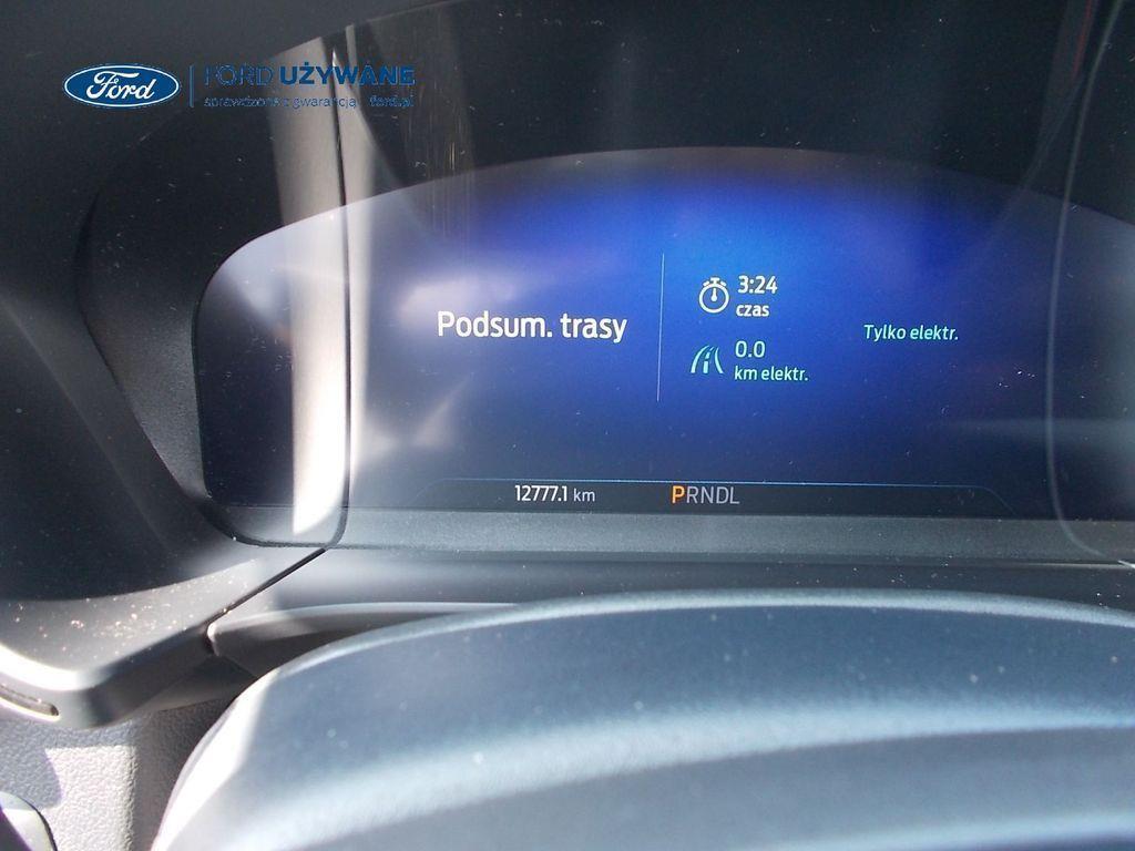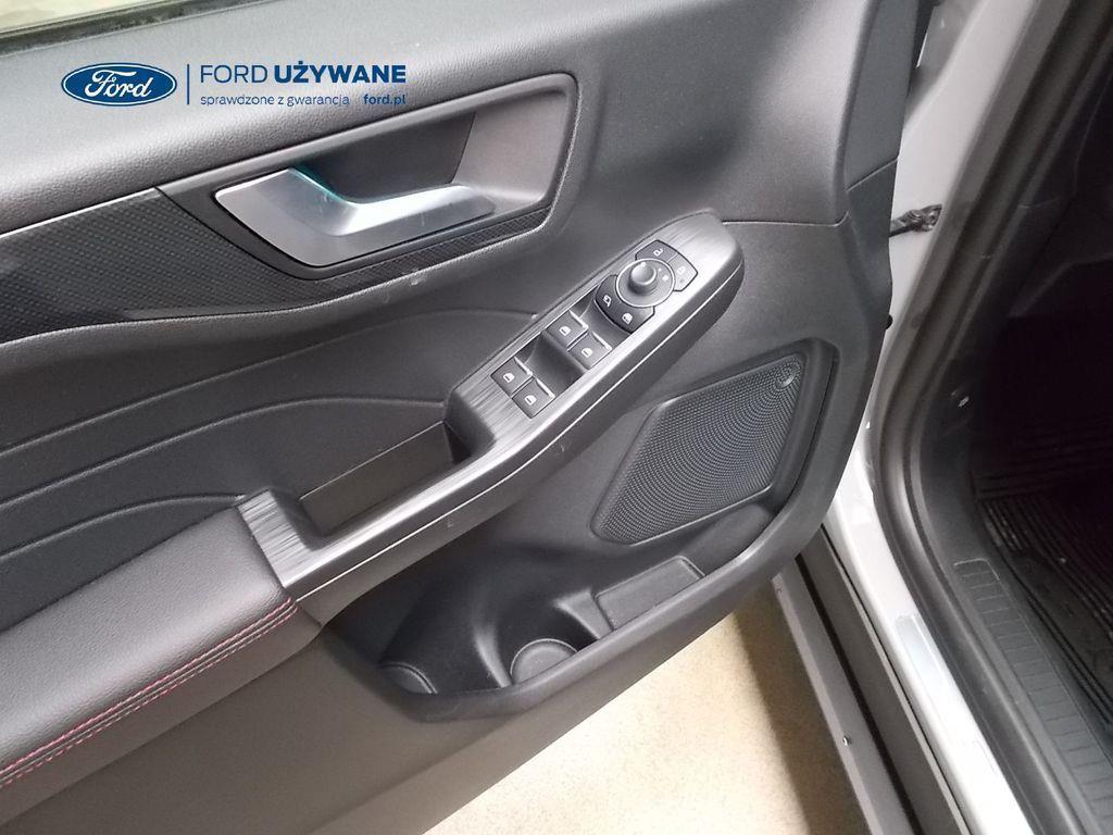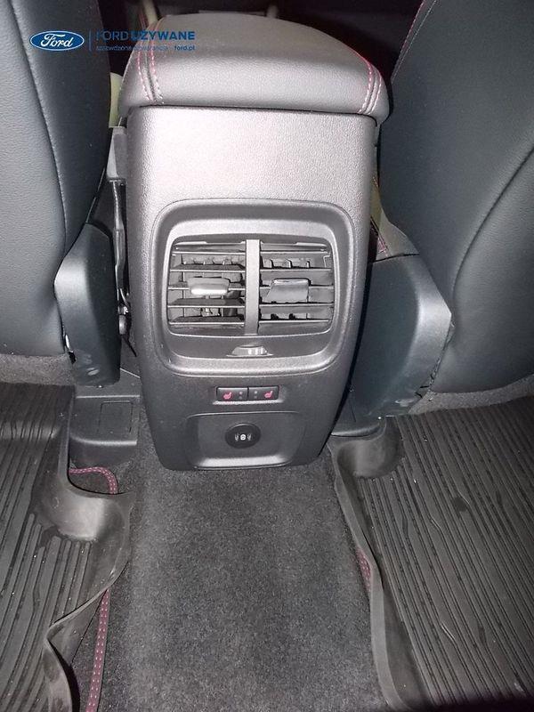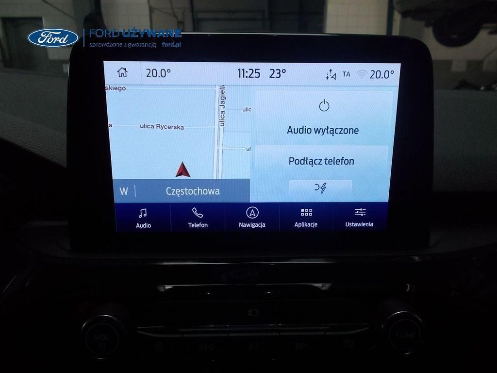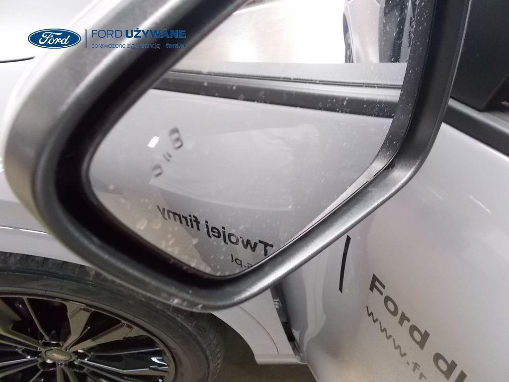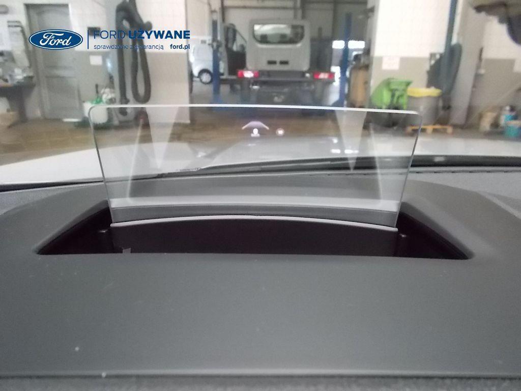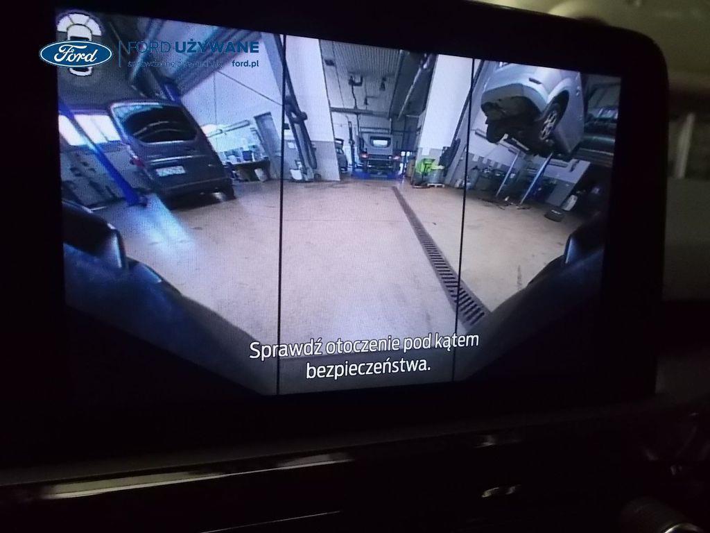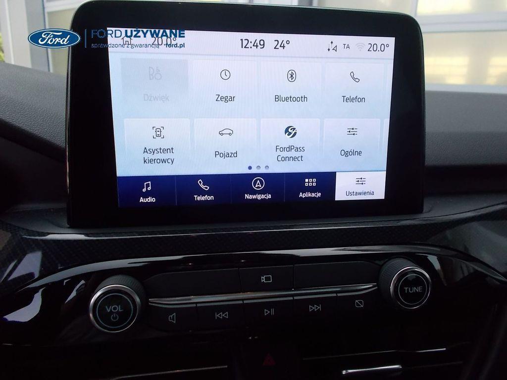 Elektroniczny układ stabilizacji toru jazdy – z układem poprawiającym stabilność na zakrętach (TVC)1), układem ułatwiającym ruszanie na wzniesieniach Elektryczny hamulec postojowy Lane Keeping Alert Pre-Collision Assist - działajacy w oparciu o informacje z kamery przedniej system wspomagający kierowcę w unikaniu lub zmniejszaniu skutków kolizji z poprzedzającymi pojazdami, pieszymi lub rowerzystami do prędkości maksymalnej pojazdu 120 km/h System monitorowania ciśnienia w oponach System ABS– z elektronicznym układem podziału siły hamowania Blokada zamków tylnych drzwi uniemożliwiająca otwarcie ich od środka przez dzieci Ford KeyFree FordPass Connect z modemem GSM - zawiera: zdalne zamykanie/otwieranie zamków drzwi, funkcję lokalizacji pojazdu, status systemów pokładowych, informację o ruchu drogowym przez kanał GSM (Live Traffic - bezpłatna subskrypcja na 1 rok), aktualizację map nawigacji przez Wi-Fi Radioodtwarzacz z SYNC 3, DAB+, nawigacją satelitarną i B&O – kolorowy wyświetlacz dotykowy 8", konfigurowalny wyświetlacz na tablicy zegarów 12.3", Apple CarPlay, Android Auto, zestaw głośnomówiący z Bluetooth® i rozbudowaną funkcją sterowania głosem w języku polskim oraz funkcją wzywania pomocy, system nagłośnienia B&O (9 głośników + subwoofer), gniazdo USB, zdalne sterowanie na kierownicy, mapy Europy z widokiem 3D, menu tekstowe w języku polskim, komunikaty głosowe i menu tekstowe nawigacji w języku polskim (ICFAH) Wyświetlacz na tablicy zegarów - 12.3" kolorowy Klimatyzacja - dwustrefowa z automatyczną regulacją temperatury Adaptive Cruise Control z funkcją Stop & Go - tempomat adaptacyjny z funkcją utrzymania pojazdu na środku pasa ruchu oraz funkcją automatycznego zatrzymania i ponownego rozpoczęcia jazdy Konsola centralna - 2 gniazda USB z tyłu konsoli Lusterko wsteczne – automatycznie ściemniające się Oświetlenie wnętrza – diodami LED z elementami nastrojowego oświetlenia Przycisk rozrusznika – Ford Power Szyby – elektrycznie sterowane szyby przednich i tylnych drzwi - opuszczanie i podnoszenie jednym naciśnięciem przycisku Fotel kierowcy – elektryczna regulacja podparcia odcinka lędźwiowego Fotel kierowcy – elektryczna regulacja położenia w 10. kierunkach Fotel pasażera – regulacja podparcia odcinka lędźwiowego Tylna kanapa – przesuwana, składana, dzielona w proporcji 60:40, z regulacją pochylenia oparć Gniazdko 12V w bagażniku Dodatkowo przyciemniane szyby – w tylnej części nadwozia Dwie końcówki układu wydechowego w stylizacji sportowej Lusterka boczne – sterowane, podgrzewane i składane elektrycznie, z lampkami oświetlającymi podłoże Pakiet stylizacyjny nadwozia ST-Line - stylizowane zderzaki, profilowane nakładki na nadkola lakierowane w kolorze nadwozia, listwy progowe i listwy boczne nadwozia Relingi bagażnika dachowego – z wykończeniem w kolorze czarnym System wyboru trybu jazdy Zawieszenie - sportowe Auto High Beam - system automatycznego sterowania światłami drogowymi Czujniki parkowania – z tyłu i z przodu Drzwi bagażnika – zamykane/ otwierane elektrycznie i bezdotykowo Kamera ułatwiająca parkowanie - z tyłu Reflektory - światla przeciwmgielne LED Wycieraczki przedniej szyby – sterowane automatycznie, z czujnikiem deszczu