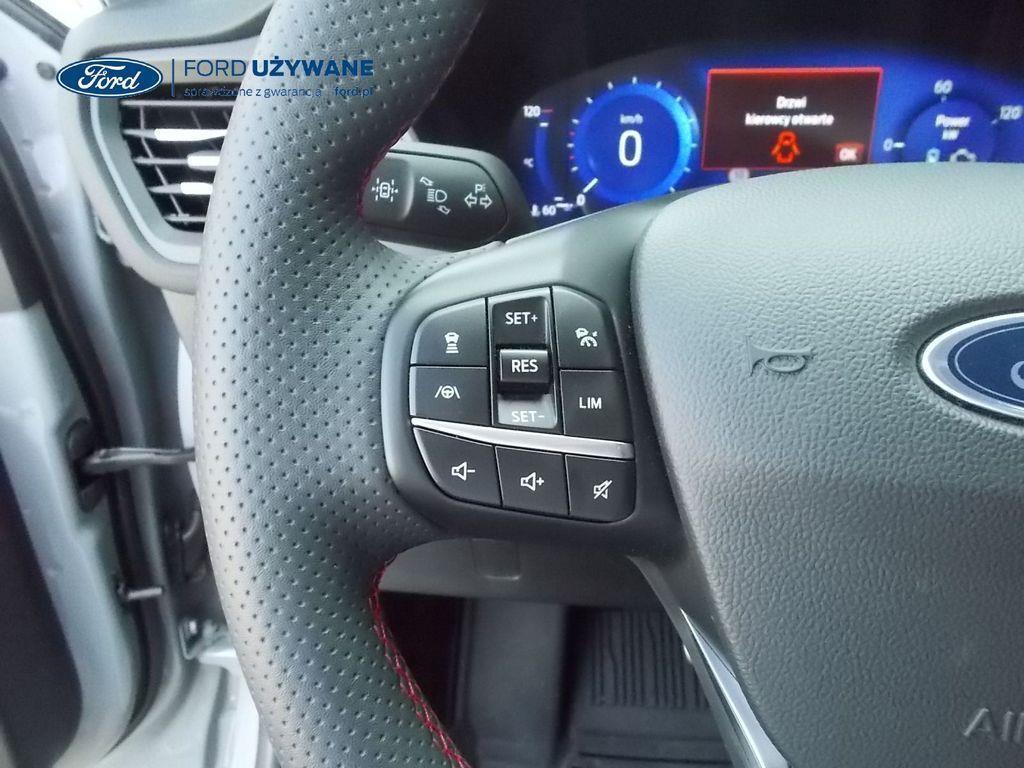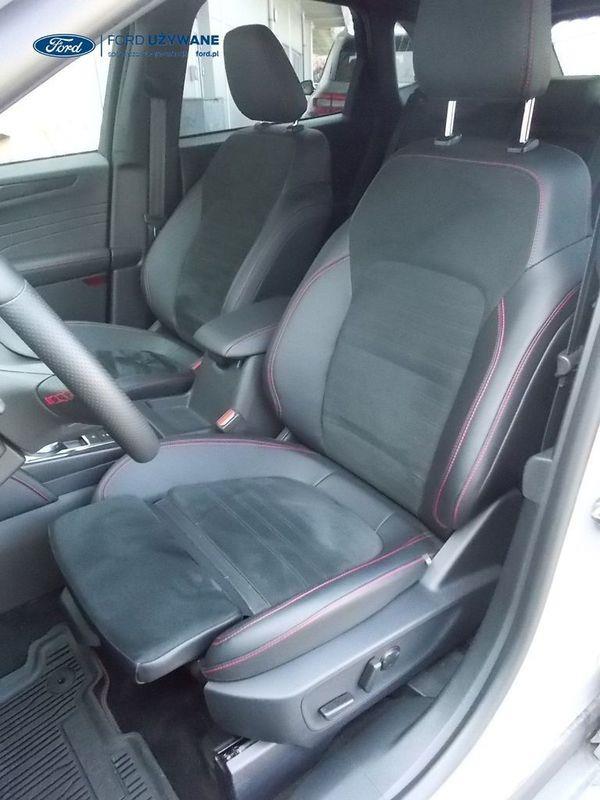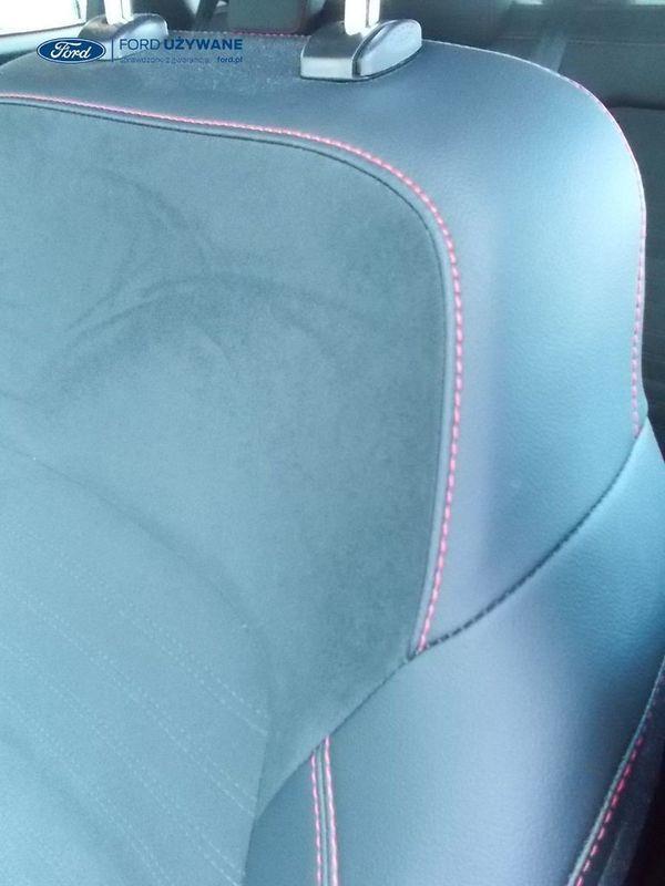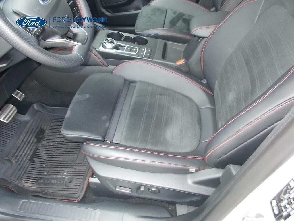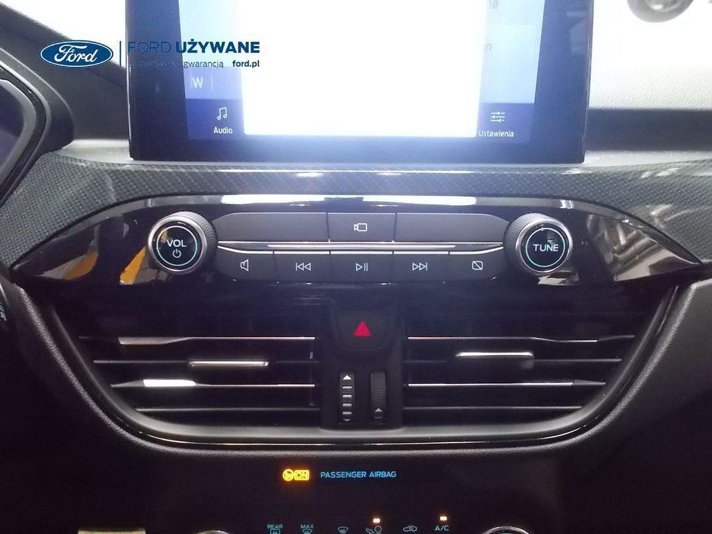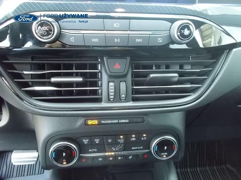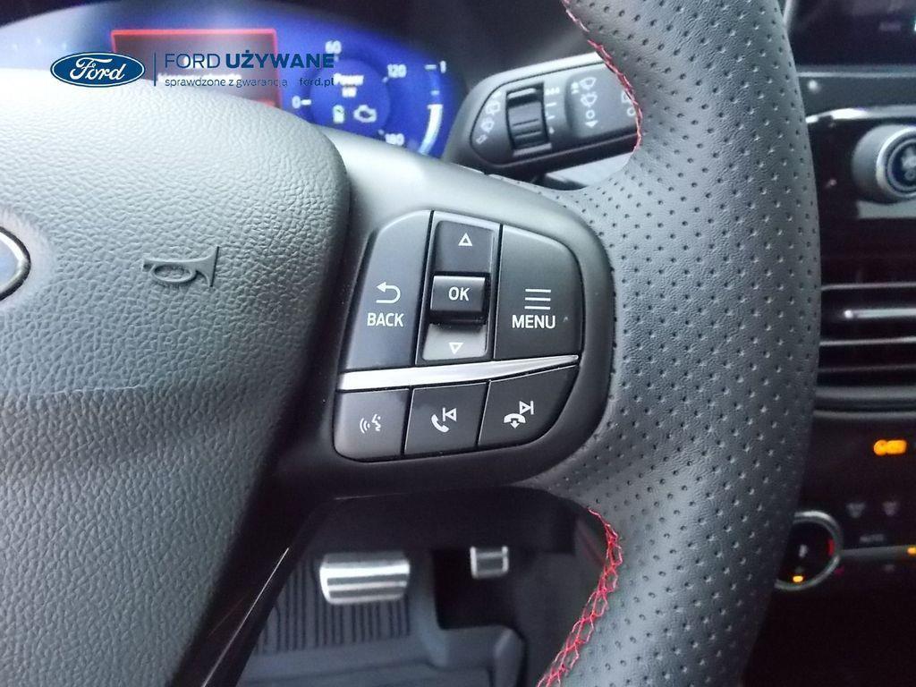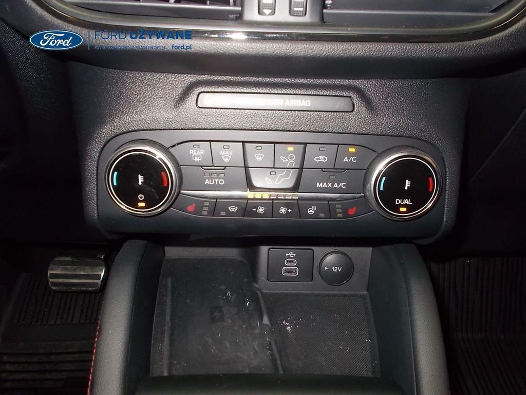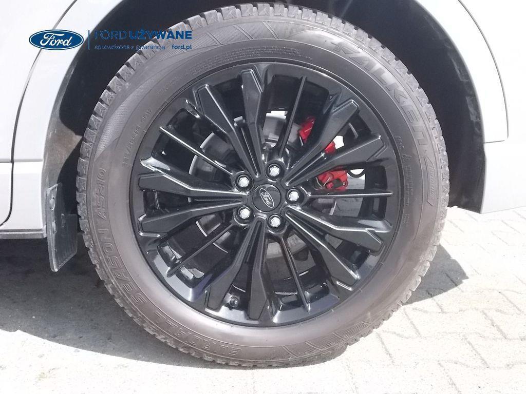 Elektroniczny układ stabilizacji toru jazdy – z układem poprawiającym stabilność na zakrętach (TVC)1), układem ułatwiającym ruszanie na wzniesieniach Elektryczny hamulec postojowy Lane Keeping Alert Pre-Collision Assist - działajacy w oparciu o informacje z kamery przedniej system wspomagający kierowcę w unikaniu lub zmniejszaniu skutków kolizji z poprzedzającymi pojazdami, pieszymi lub rowerzystami do prędkości maksymalnej pojazdu 120 km/h System monitorowania ciśnienia w oponach System ABS– z elektronicznym układem podziału siły hamowania Blokada zamków tylnych drzwi uniemożliwiająca otwarcie ich od środka przez dzieci Ford KeyFree FordPass Connect z modemem GSM - zawiera: zdalne zamykanie/otwieranie zamków drzwi, funkcję lokalizacji pojazdu, status systemów pokładowych, informację o ruchu drogowym przez kanał GSM (Live Traffic - bezpłatna subskrypcja na 1 rok), aktualizację map nawigacji przez Wi-Fi Radioodtwarzacz z SYNC 3, DAB+, nawigacją satelitarną i B&O – kolorowy wyświetlacz dotykowy 8", konfigurowalny wyświetlacz na tablicy zegarów 12.3", Apple CarPlay, Android Auto, zestaw głośnomówiący z Bluetooth® i rozbudowaną funkcją sterowania głosem w języku polskim oraz funkcją wzywania pomocy, system nagłośnienia B&O (9 głośników + subwoofer), gniazdo USB, zdalne sterowanie na kierownicy, mapy Europy z widokiem 3D, menu tekstowe w języku polskim, komunikaty głosowe i menu tekstowe nawigacji w języku polskim (ICFAH) Wyświetlacz na tablicy zegarów - 12.3" kolorowy Klimatyzacja - dwustrefowa z automatyczną regulacją temperatury Adaptive Cruise Control z funkcją Stop & Go - tempomat adaptacyjny z funkcją utrzymania pojazdu na środku pasa ruchu oraz funkcją automatycznego zatrzymania i ponownego rozpoczęcia jazdy Konsola centralna - 2 gniazda USB z tyłu konsoli Lusterko wsteczne – automatycznie ściemniające się Oświetlenie wnętrza – diodami LED z elementami nastrojowego oświetlenia Przycisk rozrusznika – Ford Power Szyby – elektrycznie sterowane szyby przednich i tylnych drzwi - opuszczanie i podnoszenie jednym naciśnięciem przycisku Fotel kierowcy – elektryczna regulacja podparcia odcinka lędźwiowego Fotel kierowcy – elektryczna regulacja położenia w 10. kierunkach Fotel pasażera – regulacja podparcia odcinka lędźwiowego Tylna kanapa – przesuwana, składana, dzielona w proporcji 60:40, z regulacją pochylenia oparć Gniazdko 12V w bagażniku Dodatkowo przyciemniane szyby – w tylnej części nadwozia Dwie końcówki układu wydechowego w stylizacji sportowej Lusterka boczne – sterowane, podgrzewane i składane elektrycznie, z lampkami oświetlającymi podłoże Pakiet stylizacyjny nadwozia ST-Line - stylizowane zderzaki, profilowane nakładki na nadkola lakierowane w kolorze nadwozia, listwy progowe i listwy boczne nadwozia Relingi bagażnika dachowego – z wykończeniem w kolorze czarnym System wyboru trybu jazdy Zawieszenie - sportowe Auto High Beam - system automatycznego sterowania światłami drogowymi Czujniki parkowania – z tyłu i z przodu Drzwi bagażnika – zamykane/ otwierane elektrycznie i bezdotykowo Kamera ułatwiająca parkowanie - z tyłu Reflektory - światla przeciwmgielne LED Wycieraczki przedniej szyby – sterowane automatycznie, z czujnikiem deszczu
