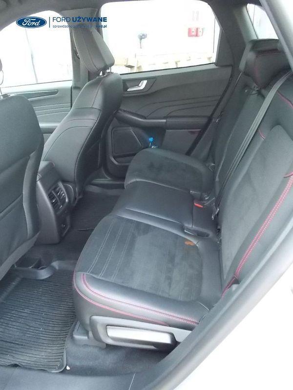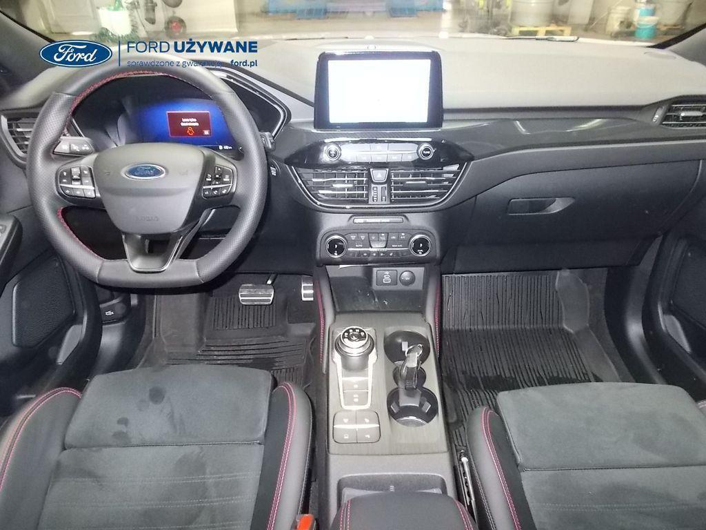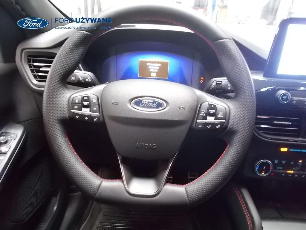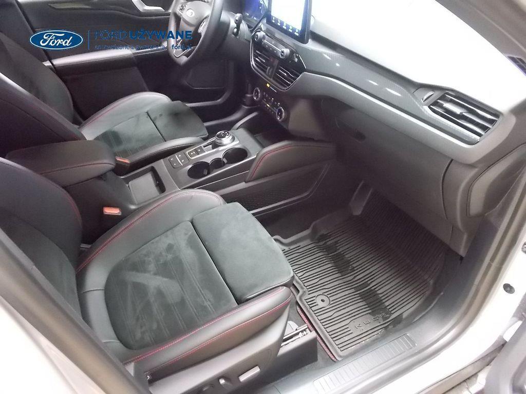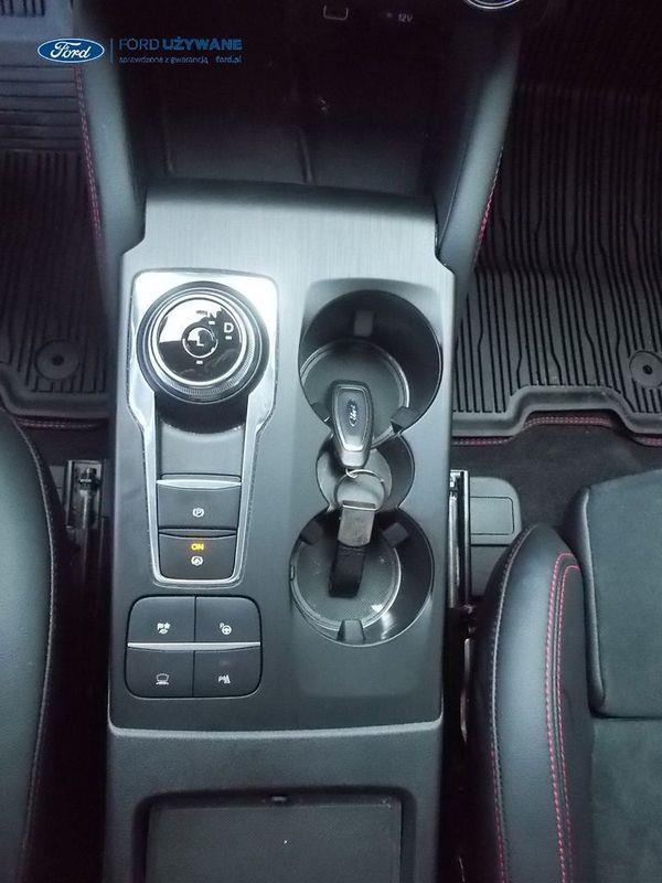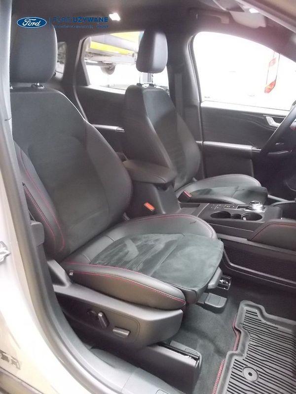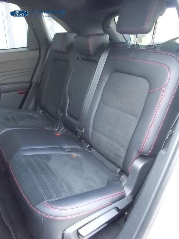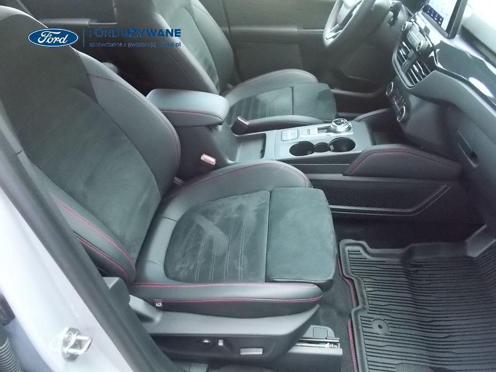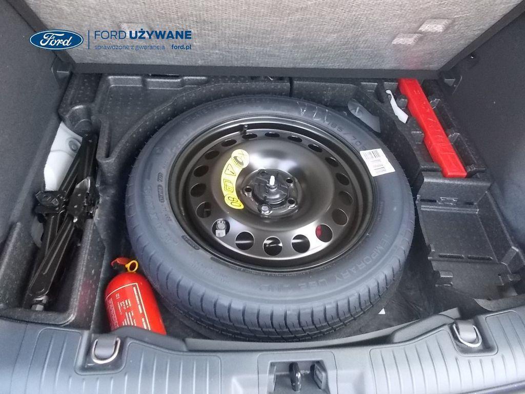 Elektroniczny układ stabilizacji toru jazdy – z układem poprawiającym stabilność na zakrętach (TVC)1), układem ułatwiającym ruszanie na wzniesieniach Elektryczny hamulec postojowy Lane Keeping Alert Pre-Collision Assist - działajacy w oparciu o informacje z kamery przedniej system wspomagający kierowcę w unikaniu lub zmniejszaniu skutków kolizji z poprzedzającymi pojazdami, pieszymi lub rowerzystami do prędkości maksymalnej pojazdu 120 km/h System monitorowania ciśnienia w oponach System ABS– z elektronicznym układem podziału siły hamowania Blokada zamków tylnych drzwi uniemożliwiająca otwarcie ich od środka przez dzieci Ford KeyFree FordPass Connect z modemem GSM - zawiera: zdalne zamykanie/otwieranie zamków drzwi, funkcję lokalizacji pojazdu, status systemów pokładowych, informację o ruchu drogowym przez kanał GSM (Live Traffic - bezpłatna subskrypcja na 1 rok), aktualizację map nawigacji przez Wi-Fi Radioodtwarzacz z SYNC 3, DAB+, nawigacją satelitarną i B&O – kolorowy wyświetlacz dotykowy 8", konfigurowalny wyświetlacz na tablicy zegarów 12.3", Apple CarPlay, Android Auto, zestaw głośnomówiący z Bluetooth® i rozbudowaną funkcją sterowania głosem w języku polskim oraz funkcją wzywania pomocy, system nagłośnienia B&O (9 głośników + subwoofer), gniazdo USB, zdalne sterowanie na kierownicy, mapy Europy z widokiem 3D, menu tekstowe w języku polskim, komunikaty głosowe i menu tekstowe nawigacji w języku polskim (ICFAH) Wyświetlacz na tablicy zegarów - 12.3" kolorowy Klimatyzacja - dwustrefowa z automatyczną regulacją temperatury Adaptive Cruise Control z funkcją Stop & Go - tempomat adaptacyjny z funkcją utrzymania pojazdu na środku pasa ruchu oraz funkcją automatycznego zatrzymania i ponownego rozpoczęcia jazdy Konsola centralna - 2 gniazda USB z tyłu konsoli Lusterko wsteczne – automatycznie ściemniające się Oświetlenie wnętrza – diodami LED z elementami nastrojowego oświetlenia Przycisk rozrusznika – Ford Power Szyby – elektrycznie sterowane szyby przednich i tylnych drzwi - opuszczanie i podnoszenie jednym naciśnięciem przycisku Fotel kierowcy – elektryczna regulacja podparcia odcinka lędźwiowego Fotel kierowcy – elektryczna regulacja położenia w 10. kierunkach Fotel pasażera – regulacja podparcia odcinka lędźwiowego Tylna kanapa – przesuwana, składana, dzielona w proporcji 60:40, z regulacją pochylenia oparć Gniazdko 12V w bagażniku Dodatkowo przyciemniane szyby – w tylnej części nadwozia Dwie końcówki układu wydechowego w stylizacji sportowej Lusterka boczne – sterowane, podgrzewane i składane elektrycznie, z lampkami oświetlającymi podłoże Pakiet stylizacyjny nadwozia ST-Line - stylizowane zderzaki, profilowane nakładki na nadkola lakierowane w kolorze nadwozia, listwy progowe i listwy boczne nadwozia Relingi bagażnika dachowego – z wykończeniem w kolorze czarnym System wyboru trybu jazdy Zawieszenie - sportowe Auto High Beam - system automatycznego sterowania światłami drogowymi Czujniki parkowania – z tyłu i z przodu Drzwi bagażnika – zamykane/ otwierane elektrycznie i bezdotykowo Kamera ułatwiająca parkowanie - z tyłu Reflektory - światla przeciwmgielne LED Wycieraczki przedniej szyby – sterowane automatycznie, z czujnikiem deszczu