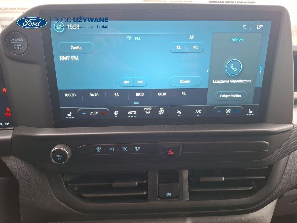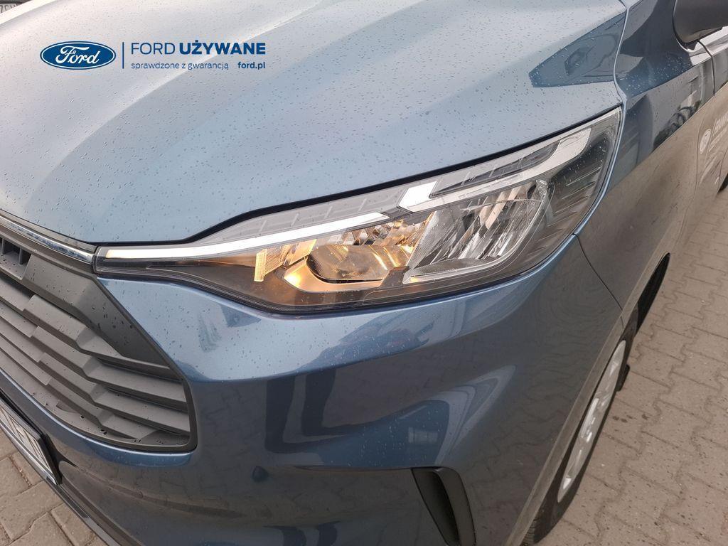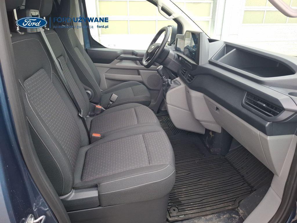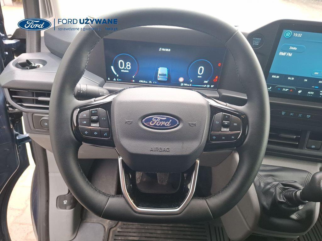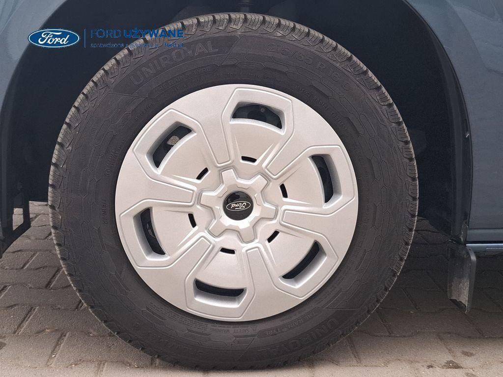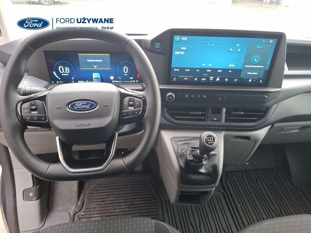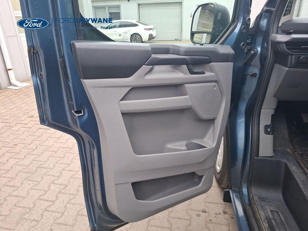 Wyposażenie standardowe Czujniki parkowania – przód Czujniki parkowania – tył Elektryczny układ wspomagania kierownicy Hamulce – elektroniczne wspomaganie siły hamowania, system stabilizacji toru jazdy przyczepy TSC, układ ułatwiający ruszanie na wzniesieniach, elektroniczny system stabilizacji toru jazdy (ESC), system kontroli trakcji i system ABS Hamulce – system stabilizacji toru jazdy przyczepy TSC, układ ułatwiający ruszanie na wzniesieniach, elektroniczny system stabilizacji toru jazdy (ESC), system kontroli trakcji i system ABS (Tylko dla silników EcoBlue) Inteligentny ogranicznik prędkości Komputer pokładowy – zasięg na paliwie w zbiorniku, chwilowe i średnie zużycie paliwa, średnia prędkość, temperatura zewnętrzna Lusterka boczne – elektrycznie sterowane i podgrzewane Monitor stanu pojazdu - system informacji dla kierowcy Możliwość wyboru trybu jazdy Podgrzewana przednia szyba „Quickclear” Poduszka powietrzna kierowcy Przycisk rozrusznika „Ford Power” Standardowy zbiornik paliwa (diesel) – 55 litrów System kontroli pasa ruchu System monitorowania ciśnienia w oponach System rozpoznawania znaków ograniczenia prędkości System tankowania bez korka wlewu „Ford Easy Fuel” z zabezpieczeniem przed wlaniem niewłaściwego paliwa (Nie dotyczy silnika elektrycznego) System Wrong Way Alert System zapobiegający kolizjom (kamera) z asystentem skrętu w lewo Układ ułatwiający ruszanie pod górę (HSA) Zbiornik AdBlue® – 21 litrów ICE Pack 2 – radio cyfrowe DAB, Ford SYNC 4, ekran dotykowy 13", modem FordPass Connect (5G), zestaw głośnomówiący Bluetooth® oraz 4 głośniki System e-Call Gniazdo zasilania – 1x 12V Gniazdo zasilania – 2 x USB umieszczone w tablicy rozdzielczej Klimatyzacja – z przodu pojazdu, z automatyczną regulacją temperatury Kolumna kierownicy – regulowana w dwóch płaszczyznach Zamki drzwi – zdalne sterowanie centralnego zamka z 2 pilotami Oświetlenie przestrzeni ładunkowej LED Przegroda – metalowa, bez szyby 16" obręcze stalowe z kołpakami w kolorze Sparkle Silver Chlapacze przednie Chlapacze tylne Drzwi – boczne drzwi przesuwne – po prawej stronie Drzwi tylne – dwuskrzydłowe bez szyb, kąt otwarcia 168o z blokadą przy 90o Nadwozie – dach niski H1 Reflektory – automatyczna zmiana świateł drogowych na mijania Reflektory – automatyczne włączanie Reflektory – LED dla świateł mijania, halogenowe dla świateł drogowych Reflektory — światła do jazdy dziennej Światła tylne halogenowe Tylny zderzak – częściowo w kolorze nadwozia