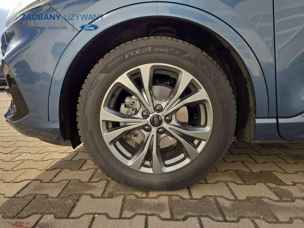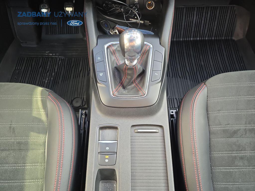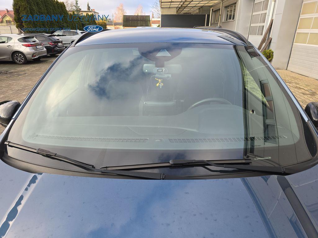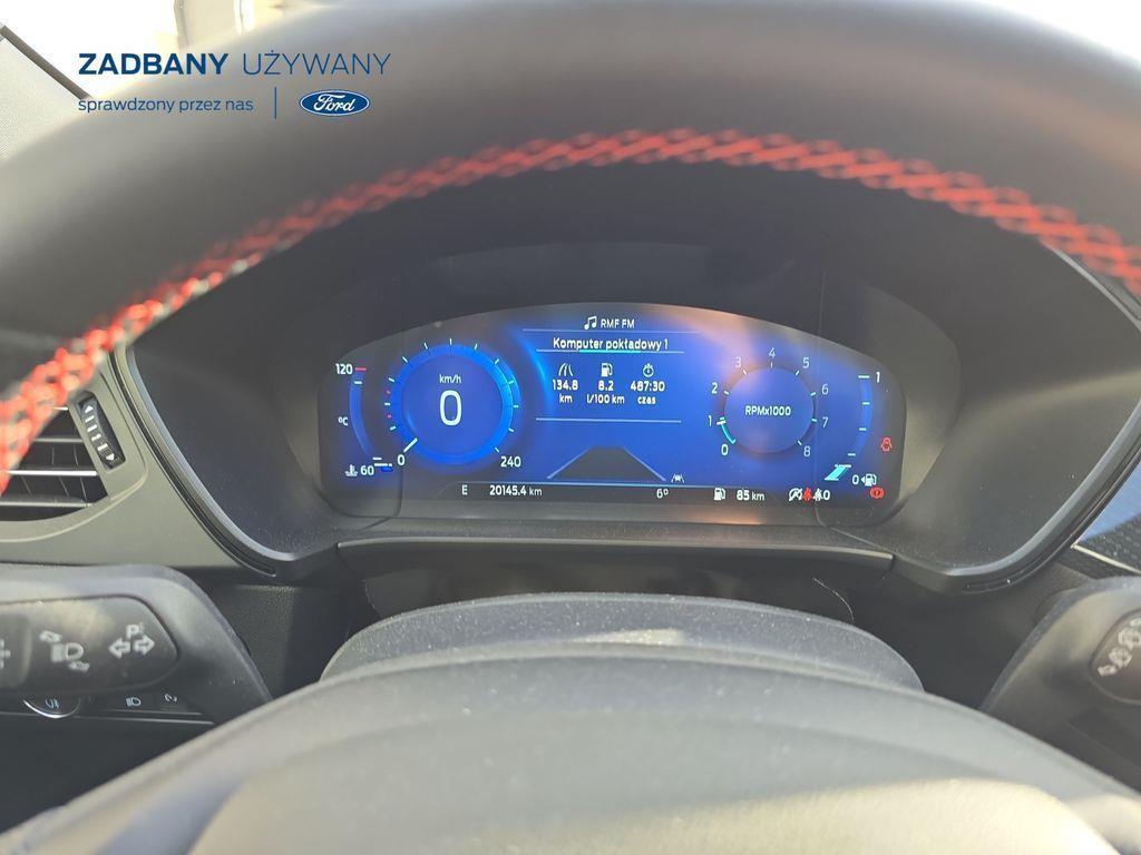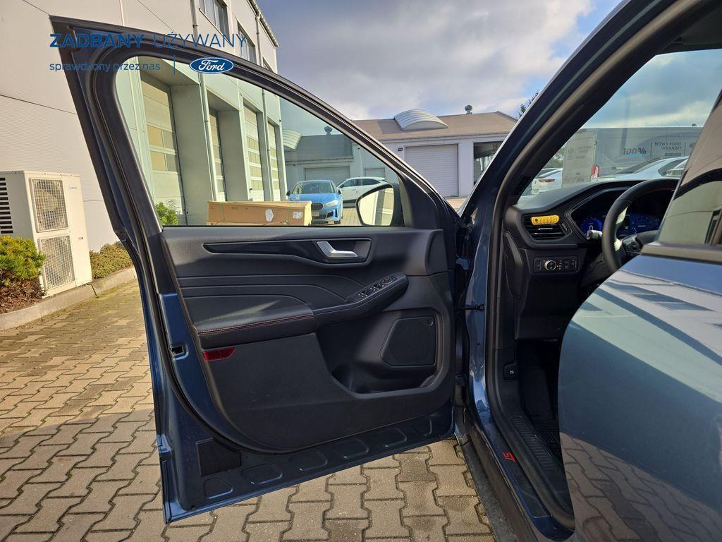 - podgrzewana tylna kanapa *Fotele – styl sportowy, tapicerka częściowo skórzana ciemna Rapton/skóra ekologiczna Sensico w ciemnej tonacji, fotel kierowcy z elektryczną regulacją położenia w 10. kierunkach, fotel pasażera z ręczną regulacją położenia w 6. kierunkach, ręczna regulacja podparcia odcinka lędźwiowego fotela kierowcy i pasażera, podłokietnik na środku tylnej kanapy) *Koło zapasowe – dojazdowe *Lakier metalizowany - Chrome Blue *Elektroniczny układ stabilizacji toru jazdy (ESC) – z układem poprawiającym stabilność na zakrętach (TVC), układem ułatwiającym ruszanie na wzniesieniach (HSA) *Elektryczny hamulec postojowy *Hamulec pokolizyjny *ISOFIX *Lane Keeping Alert (zawiera: Lane Keeping Aid (system wspomagający utrzymanie pojazdu na pasie ruchu, z funkcją wykrywania krawędzi jezdni) *Pre-Collision Assist - działajacy w oparciu o informacje z kamery przedniej system wspomagający kierowcę w unikaniu lub zmniejszaniu skutków kolizji z poprzedzającymi pojazdami, pieszymi lub rowerzystami do prędkości maksymalnej pojazdu 120 km/h *Centralny zamek – sterowany pilotem *Ford KeyFree - system centralnego zamka z kluczem elektronicznym *FordPass Connect z modemem GSM *Radioodtwarzacz z SYNC 3, DAB+ i nawigacją satelitarną – kolorowy wyświetlacz dotykowy 8", Applink 3.0, Apple CarPlay, Android Auto, TMC (informacja o ruchu drogowym), zestaw głośnomówiący z Bluetooth® i rozbudowaną funkcją sterowania głosem w języku polskim oraz funkcją wzywania pomocy, 6 głośników, gniazdo USB, zdalne sterowanie na kierownicy, mapy Europy z widokiem 3D, menu tekstowe w języku polskim, komunikaty głosowe i menu tekstowe nawigacji w języku polskim *Klimatyzacja - dwustrefowa z automatyczną regulacją temperatury *Kolumna kierownicy – z regulacją pochylenia i odległości *Podsufitka - w ciemnej tonacji *Bezprzewodowa ładowarka do smartfonów (wymaga smartfona kompatybilnego z systemem ładowania bezprzewodowego) *Ford MyKey® – funkcja programowania i przypisania do kluczyka ograniczenia: prędkości maksymalnej, maksymalnej głośności systemu audio oraz możliwość zablokowania deaktywacji systemów wspomagających bezpieczeństwo *Konsola centralna - gniazda USB oraz USB-C z tyłu konsoli *Lusterko wsteczne – automatycznie ściemniające się *Oświetlenie wnętrza – lampki do czytania map z przodu i z tyłu *Oświetlenie wnętrza – diodami LED z elementami nastrojowego oświetlenia *Przycisk rozrusznika – Ford Power *Szyby – elektrycznie sterowane szyby przednich i tylnych drzwi - opuszczanie i podnoszenie jednym naciśnięciem przycisku *Fotele kierowcy i pasażera – kieszenie na mapy z tyłu oparć przednich foteli *Tylna kanapa – przesuwana, składana, dzielona w proporcji 60:40, z regulacją pochylenia oparć *Elastyczna osłona przestrzeni bagażowej – mocowana za 2. rzędem siedzeń *Gniazdko 12V w bagażniku *Układ kierowniczy – ze wspomaganiem elektrycznym *System wyboru trybu jazdy *Obręcze kół ze stopów lekkich – z wykończeniem w kolorze Rock Metallic, *Pakiet stylizacyjny nadwozia ST-Line - stylizowane zderzaki, profilowane nakładki na nadkola lakierowane w kolorze nadwozia, listwy progowe i listwy boczne nadwozia lakierowane w kolorze nadwozia *Tylny spojler *Czujniki parkowania – z tyłu i z przodu *Kamera ułatwiająca parkowanie - z tyłu *Reflektory - światla przeciwmgielne LED *Reflektory – ze światłami mijania LED oraz światłami do jazdy dziennej LED *Reflektory automatyczne – włączające się automatycznie w zależności od poziomu natężenia światła ─────────────────────────────────────────────────────────────
