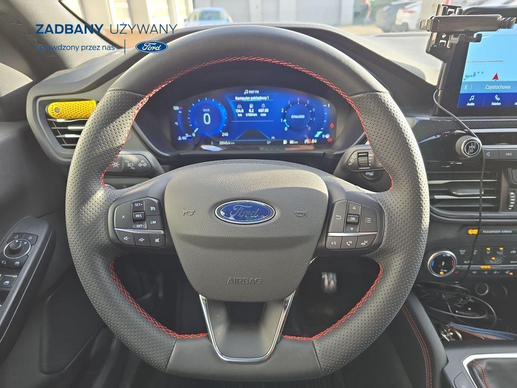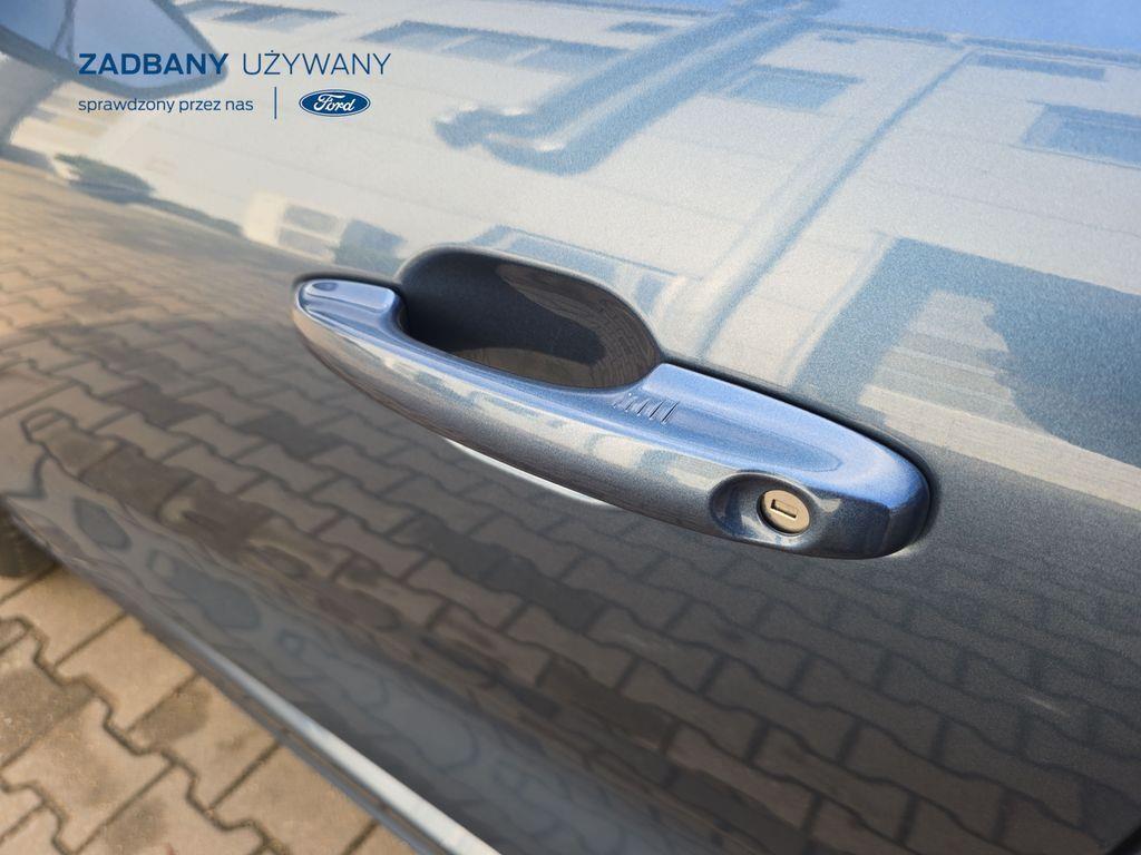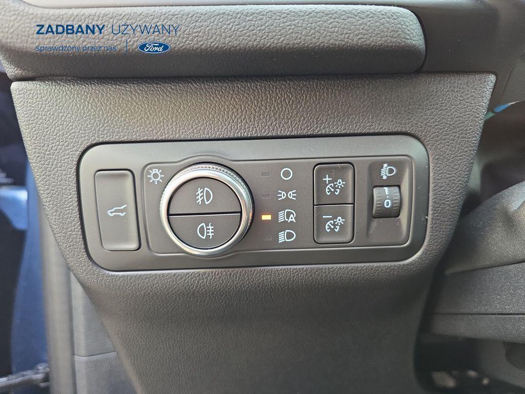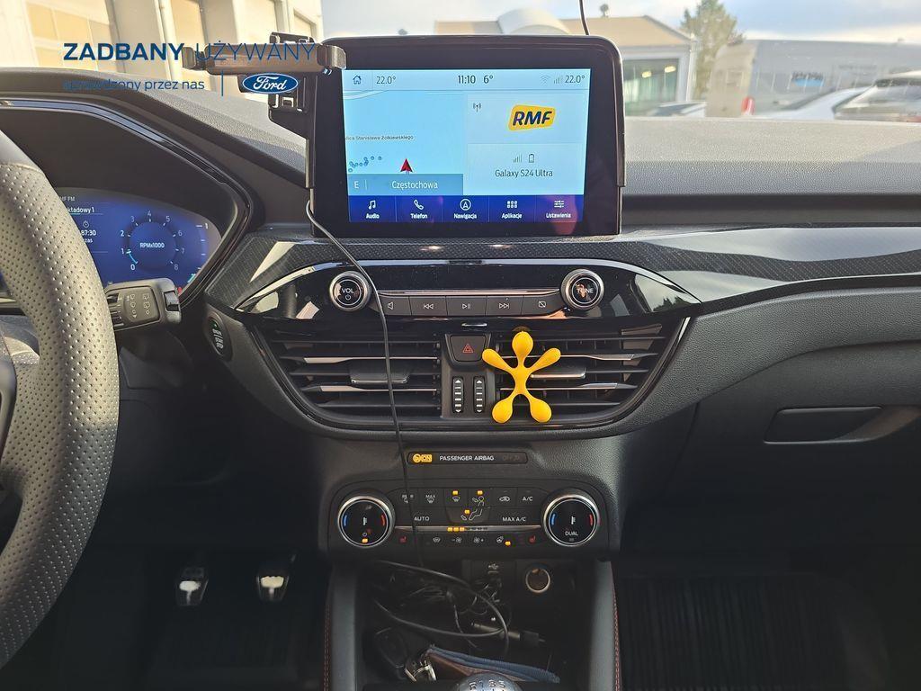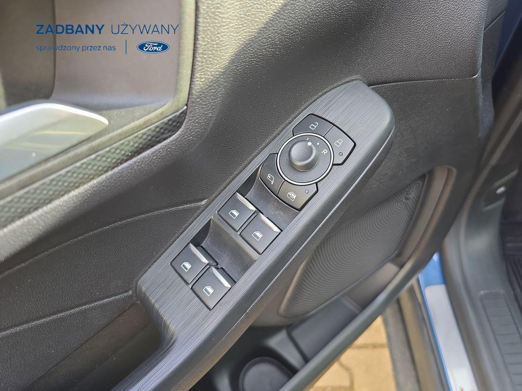 - podgrzewana tylna kanapa *Fotele – styl sportowy, tapicerka częściowo skórzana ciemna Rapton/skóra ekologiczna Sensico w ciemnej tonacji, fotel kierowcy z elektryczną regulacją położenia w 10. kierunkach, fotel pasażera z ręczną regulacją położenia w 6. kierunkach, ręczna regulacja podparcia odcinka lędźwiowego fotela kierowcy i pasażera, podłokietnik na środku tylnej kanapy) *Koło zapasowe – dojazdowe *Lakier metalizowany - Chrome Blue *Elektroniczny układ stabilizacji toru jazdy (ESC) – z układem poprawiającym stabilność na zakrętach (TVC), układem ułatwiającym ruszanie na wzniesieniach (HSA) *Elektryczny hamulec postojowy *Hamulec pokolizyjny *ISOFIX *Lane Keeping Alert (zawiera: Lane Keeping Aid (system wspomagający utrzymanie pojazdu na pasie ruchu, z funkcją wykrywania krawędzi jezdni) *Pre-Collision Assist - działajacy w oparciu o informacje z kamery przedniej system wspomagający kierowcę w unikaniu lub zmniejszaniu skutków kolizji z poprzedzającymi pojazdami, pieszymi lub rowerzystami do prędkości maksymalnej pojazdu 120 km/h *Centralny zamek – sterowany pilotem *Ford KeyFree - system centralnego zamka z kluczem elektronicznym *FordPass Connect z modemem GSM *Radioodtwarzacz z SYNC 3, DAB+ i nawigacją satelitarną – kolorowy wyświetlacz dotykowy 8", Applink 3.0, Apple CarPlay, Android Auto, TMC (informacja o ruchu drogowym), zestaw głośnomówiący z Bluetooth® i rozbudowaną funkcją sterowania głosem w języku polskim oraz funkcją wzywania pomocy, 6 głośników, gniazdo USB, zdalne sterowanie na kierownicy, mapy Europy z widokiem 3D, menu tekstowe w języku polskim, komunikaty głosowe i menu tekstowe nawigacji w języku polskim *Klimatyzacja - dwustrefowa z automatyczną regulacją temperatury *Kolumna kierownicy – z regulacją pochylenia i odległości *Podsufitka - w ciemnej tonacji *Bezprzewodowa ładowarka do smartfonów (wymaga smartfona kompatybilnego z systemem ładowania bezprzewodowego) *Ford MyKey® – funkcja programowania i przypisania do kluczyka ograniczenia: prędkości maksymalnej, maksymalnej głośności systemu audio oraz możliwość zablokowania deaktywacji systemów wspomagających bezpieczeństwo *Konsola centralna - gniazda USB oraz USB-C z tyłu konsoli *Lusterko wsteczne – automatycznie ściemniające się *Oświetlenie wnętrza – lampki do czytania map z przodu i z tyłu *Oświetlenie wnętrza – diodami LED z elementami nastrojowego oświetlenia *Przycisk rozrusznika – Ford Power *Szyby – elektrycznie sterowane szyby przednich i tylnych drzwi - opuszczanie i podnoszenie jednym naciśnięciem przycisku *Fotele kierowcy i pasażera – kieszenie na mapy z tyłu oparć przednich foteli *Tylna kanapa – przesuwana, składana, dzielona w proporcji 60:40, z regulacją pochylenia oparć *Elastyczna osłona przestrzeni bagażowej – mocowana za 2. rzędem siedzeń *Gniazdko 12V w bagażniku *Układ kierowniczy – ze wspomaganiem elektrycznym *System wyboru trybu jazdy *Obręcze kół ze stopów lekkich – z wykończeniem w kolorze Rock Metallic, *Pakiet stylizacyjny nadwozia ST-Line - stylizowane zderzaki, profilowane nakładki na nadkola lakierowane w kolorze nadwozia, listwy progowe i listwy boczne nadwozia lakierowane w kolorze nadwozia *Tylny spojler *Czujniki parkowania – z tyłu i z przodu *Kamera ułatwiająca parkowanie - z tyłu *Reflektory - światla przeciwmgielne LED *Reflektory – ze światłami mijania LED oraz światłami do jazdy dziennej LED *Reflektory automatyczne – włączające się automatycznie w zależności od poziomu natężenia światła ─────────────────────────────────────────────────────────────