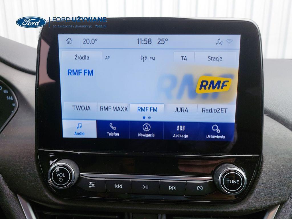- System nawigacji satelitarnej z Ford SYNC 3, DAB+ i B&O: – kolorowy wyświetlacz dotykowy 8", AppLink, Apple CarPlay, Android Auto, TMC (informacja o ruchu drogowym), zestaw głośnomówiący z Bluetooth® i rozbudowaną funkcją sterowania głosem w języku polskim oraz funkcją wzywania pomocy, system nagłośnienia B&O (wzmacniacz 575 W, 10 głośników, w tym 2 współosiowe i subwoofer), gniazda: 2xUSB, zdalne sterowanie na kierownicy, mapy Europy z widokiem 3D, krótka antena, menu tekstowe i komunikaty głosowe nawigacji w języku polskim