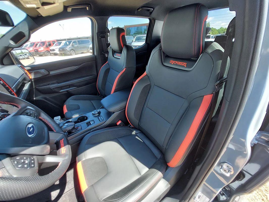 *Elektrycznie regulowane przednie fotele: fotel kierowcy regulowany w 10-ciu kierunkach fotel pasażera regulowany w 8-miu kierunkach z tapicerką skórzaną z logo Raptor, oraz funkcją przypominającą o zapięciu pasów bezpieczeństwa z przodu i z tyłu pojazdu.